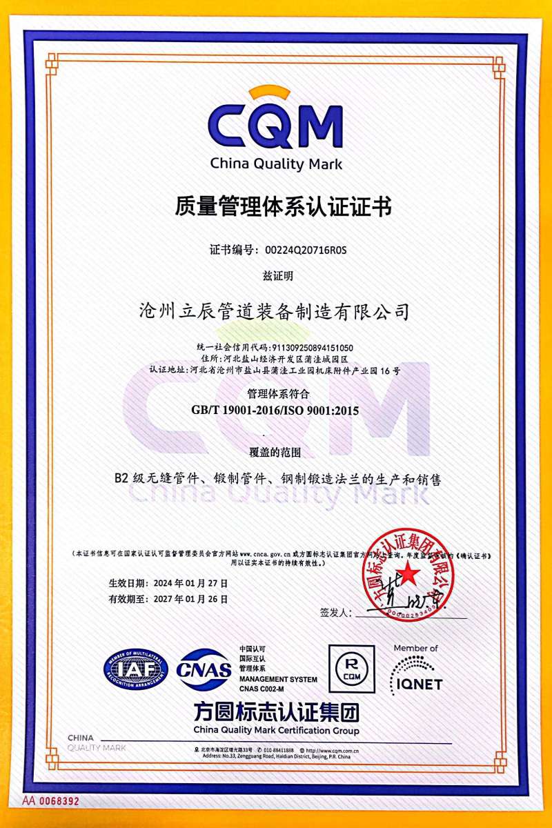 滄州立辰管道榮獲壓力管道制造許可證及ISO9001認(rèn)證,以卓越品質(zhì)引領(lǐng)行業(yè)標(biāo)桿